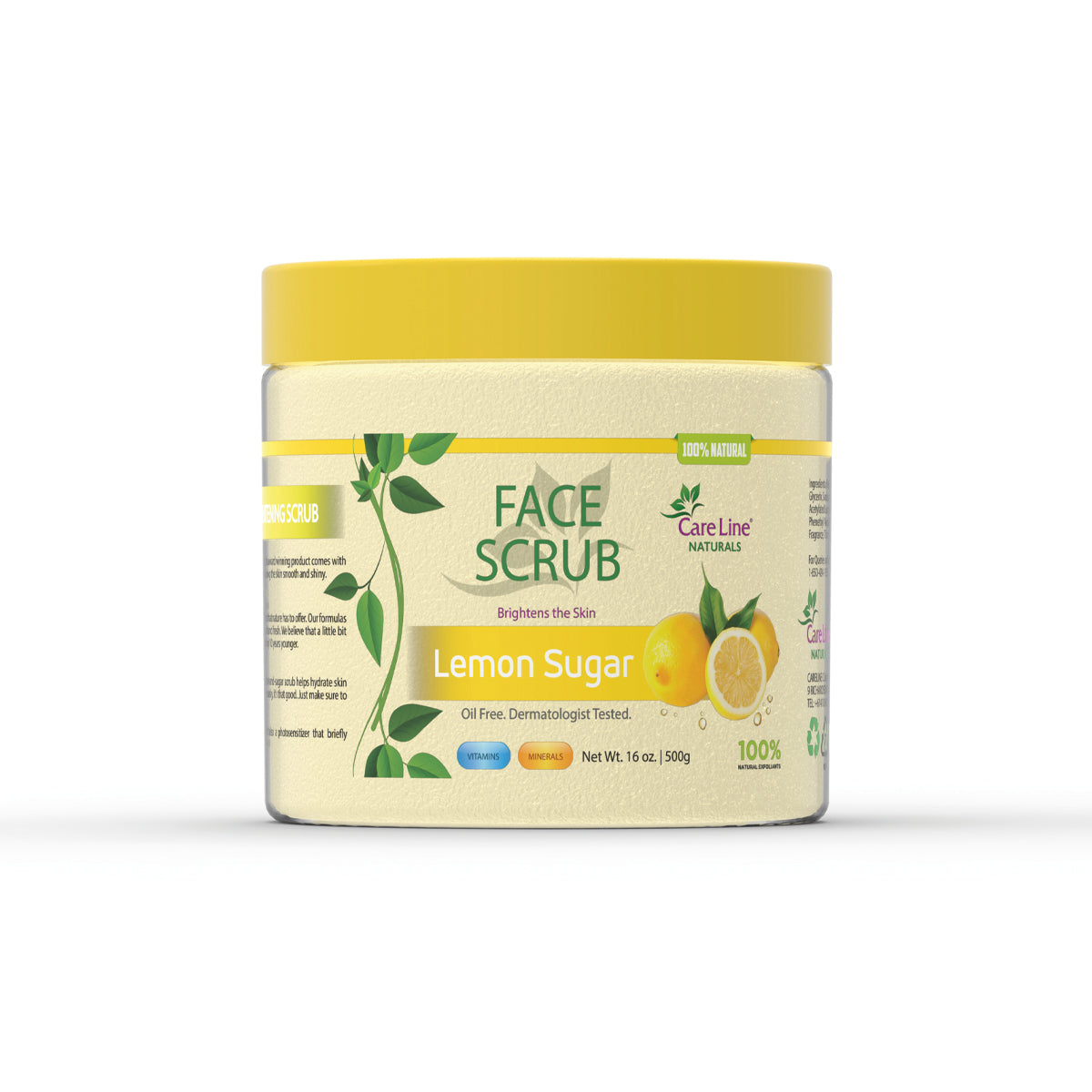 CareLine Naturals Lemon Sugar Face Scrub is a fresh and invigorating blend of natural sugar crystals and zesty lemon extract. This gentle exfoliator lifts away dead skin cells while flooding your skin with the brightening power of vitamin C and citric acid.